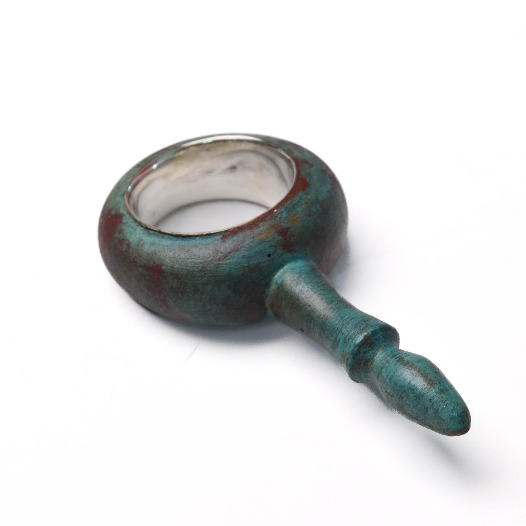 Essa coleção, diferentes das outras, é formada de peças únicas e não reproduzíveis. Com pegada antiga, os aneis têm o peso e a volumetria densa, próprios aos aneis bombê. Mas esses não são qualquer anel bombê. A textura azul e vinho da oxidação meticulosa do bronze remete às peças resgatadas de antigos naufrágios. O forro interno, em prata 950, garante acabamento e conforto. E acima do corpo da peça pequenas torres que se elevam perpendiculares à mão, como faróis, a afastar o perigo. Nesse modelo, temos uma espécie de ponteira arredondada.
