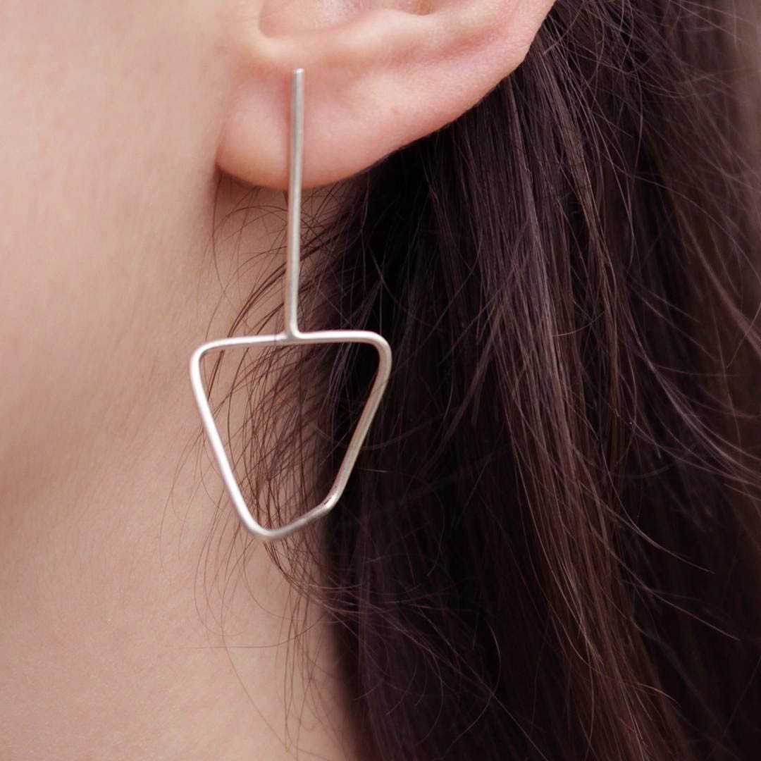 Brinco com desenho exclusivo e confecção manual de joanavp, que surge da dobra diagonal de uma moldura quadrada cujas pontas foram arredondadas. Este movimento de dobra permite sair do plano bidimensional, criando outras apreensões e relação com o rosto, conforme o ângulo de visão. Uma dica é experimentar o mesmo brinco tanto na orelha direita, quanto na esquerda.