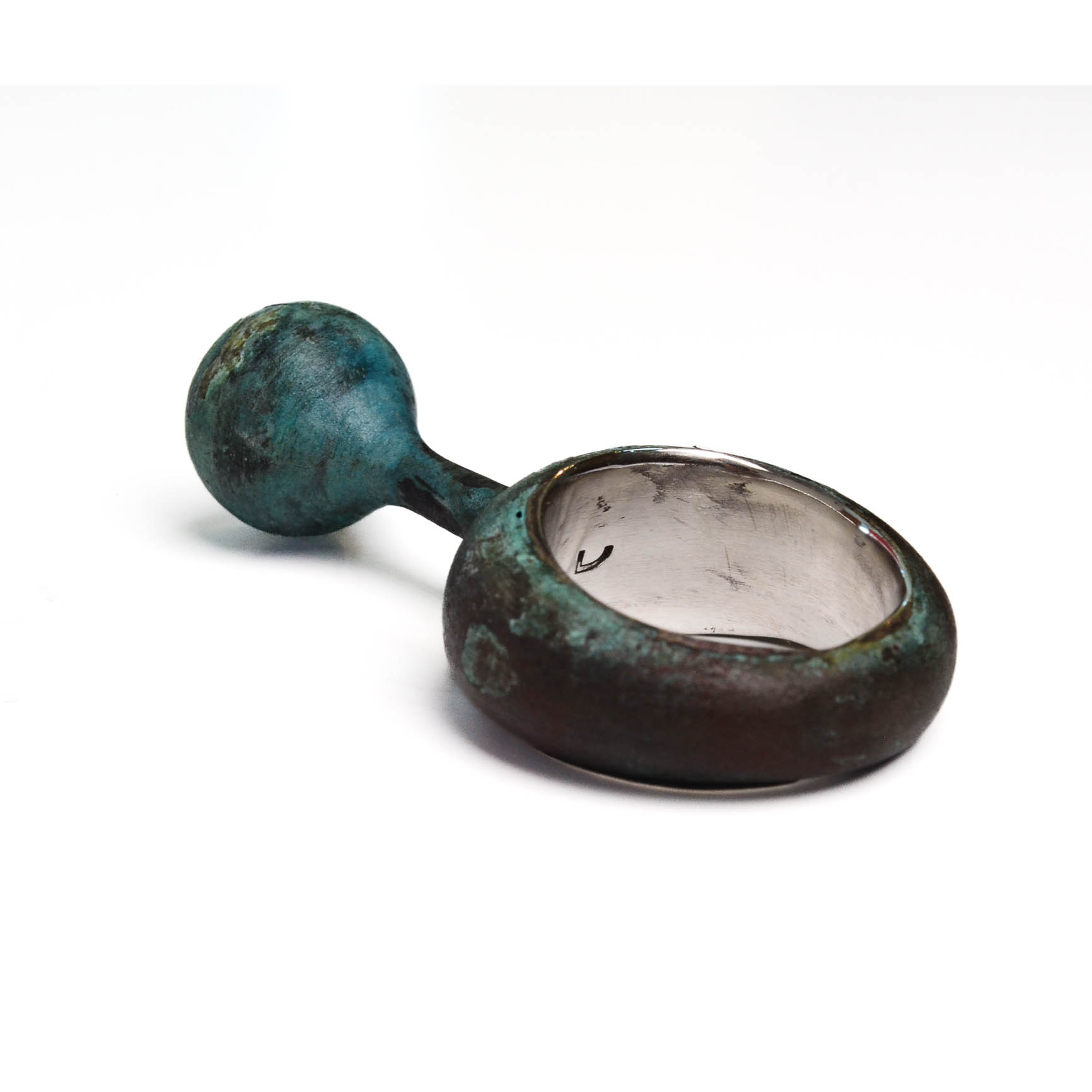 Essa coleção, diferentes das outras, é formada de peças únicas e não reproduzíveis. Com pegada antiga, os aneis têm o peso e a volumetria densa, próprios aos aneis bombê. Mas esses não são qualquer anel bombê. A textura azul e vinho da oxidação meticulosa do bronze remete às peças resgatadas de antigos naufrágios. O forro interno, em prata 950, garante acabamento e conforto. E acima do corpo da peça pequenas torres que se elevam perpendiculares à mão, como faróis, a afastar o perigo. Nesse modelo, temos uma espécie de cabaça.