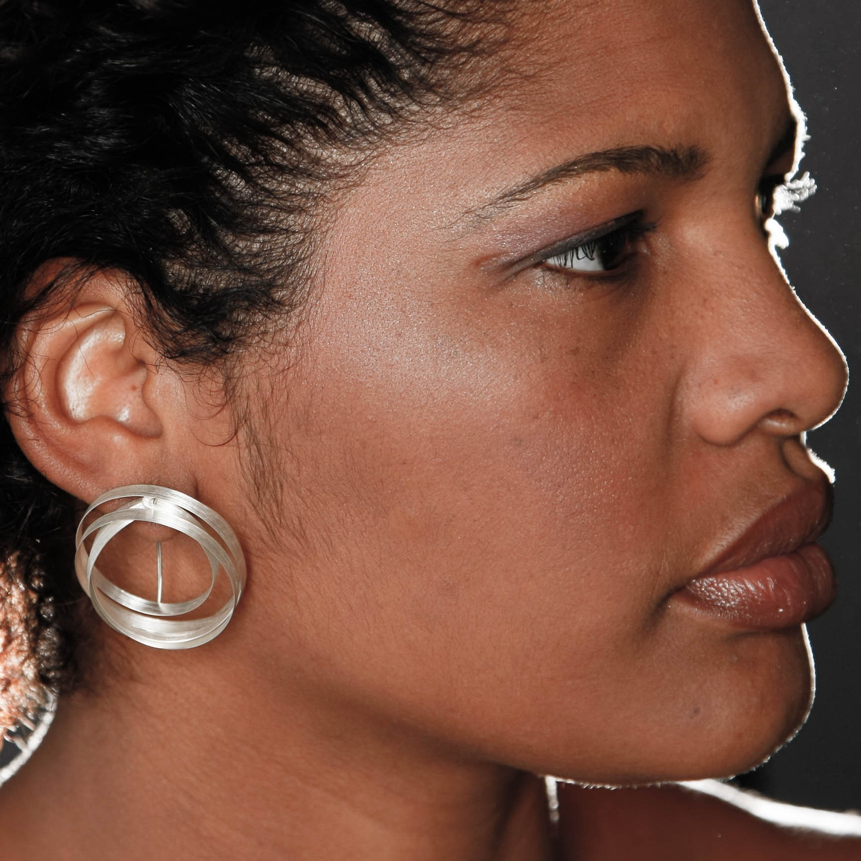 As jóias da coleção retenso são construídas a partir de uma fita de prata 950 extremamente fina, que durante o processo de laminação vai sendo temperada. A tensão que o metal adquire neste processo o mantém enrolado sobre si como uma mola flexível. Por isso, ao invés de modeladas, as peças são construídas a partir da tensão. Um brinco nunca será idêntico ao outro, cada um é único: mas se complementam.