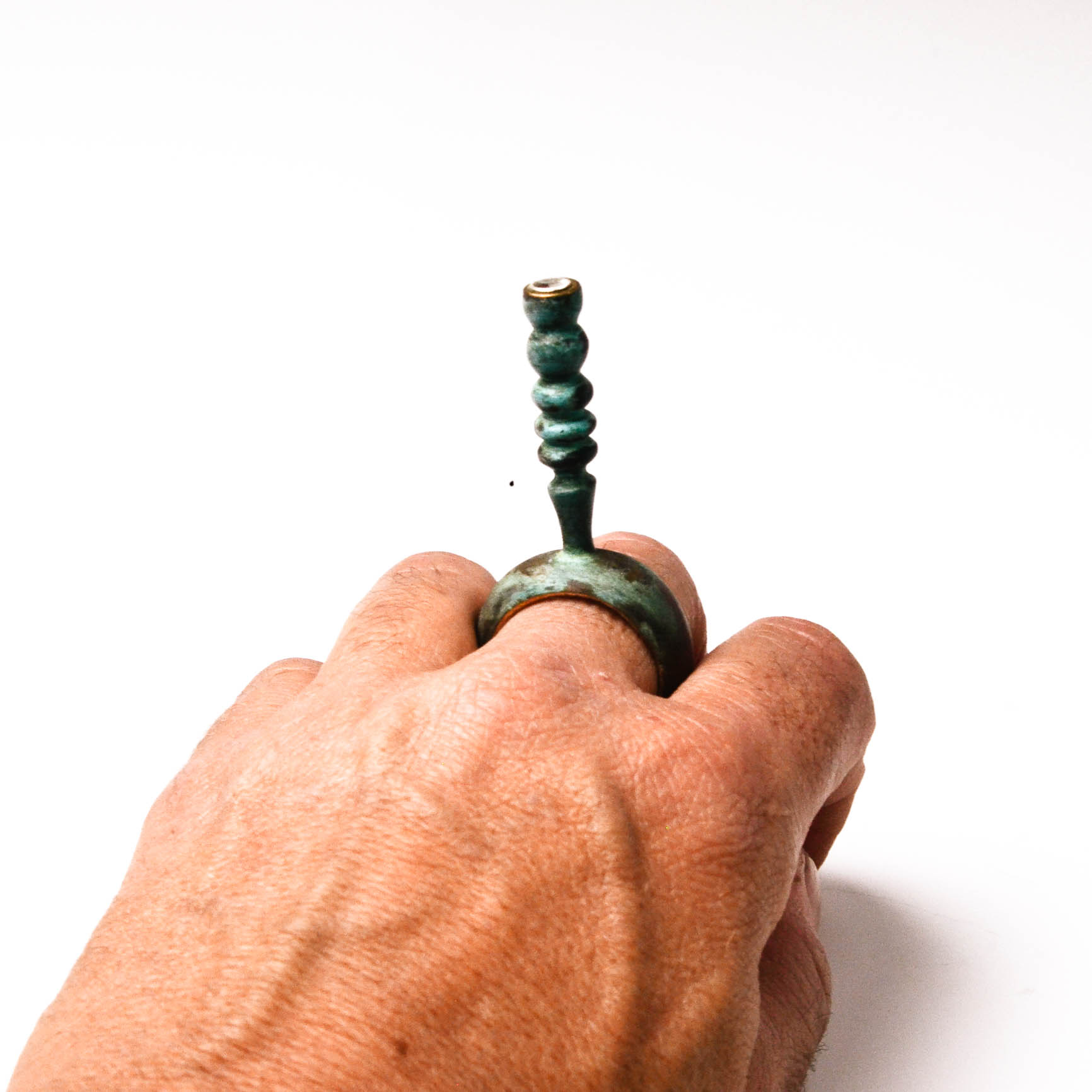 Essa coleção, diferentes das outras, é formada de peças únicas e não reproduzíveis. Com pegada antiga, os aneis têm o peso e a volumetria densa, próprios aos aneis bombê. Mas esses não são qualquer anel bombê. A textura azul e vinho da oxidação meticulosa do bronze remete às peças resgatadas de antigos naufrágios. O forro interno, em prata 950, garante acabamento e conforto. E acima do corpo da peça pequenas torres que se elevam perpendiculares à mão, como faróis, a afastar o perigo. Nesse modelo, temos uma espécie de coluna com gomos.